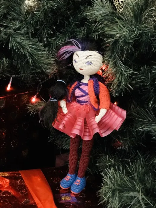 Наконец-то связалась Варя и отправилась к своим подружкам Аленке и Снежке в Москву. Связана из х/б пряжи, каркас из медной проволоки. Лицо вышивка. Юбка пачка из капроновой ленты. Жакетик съемный спицами связан. И еще рюкзачок за плечами с конфеткой.