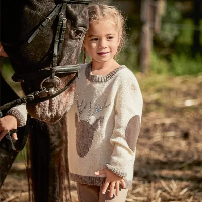На джемпере так красиво сверкают рога из стразов! А на рукавах сделаны декоративные заплатки, чтобы не слишком быстро протерлись локти.