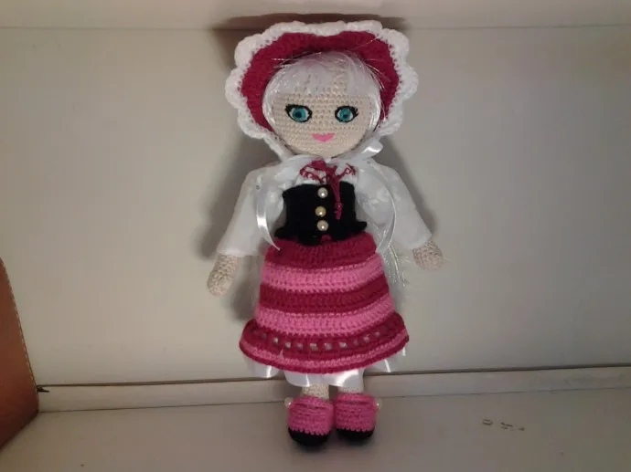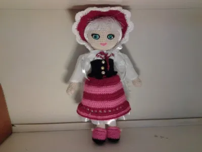 После долгих мучений "родилась" вот такая куколка - Фройлен Грета. Рост 22 см. Личико вышитое. Волосы можно аккуратно расчесывать, меняя прическу. Одежка вся съемная, включая туфельки.