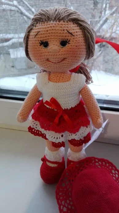 Родилась новая куколка. Связана на заказ. Пряжа тело: Газаль хлопок, туфельки Картопу хлопок для Амигуруми, платье Анна 16 хлопок. Волосы тонкий акрил (не помню как пряжа называется), немножко кружева для носочков и мулине для оформления личика. Набивка синтепух.