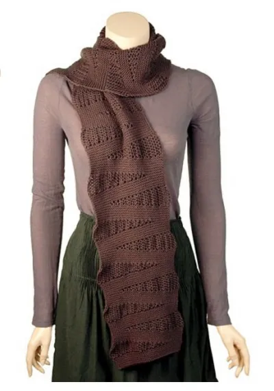 Узор формируется из коротких полос, которые вяжутся через весь ряд, затем шарф переворачивается на изнаночную сторону. Дырочки, вызванные поворотом вязания, являются частью узора.