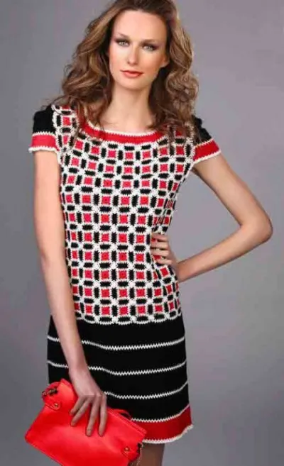 Верх платья состоит из красных (1) и черных (2) мотивов, которые соединены между собой белой пряжей (последний ряд мотива 2).