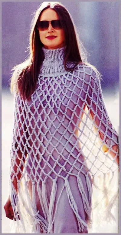 Накидка: вдоль основания воротника вяжите сетчатым узором: введите крючок на уровне шва и вяжите 1 ст. 6/н, * 6 в.п., пропустите 2 п., 1 ст. 6/н в следующую п. повтор. от * до * 27 раз. 3 в.п., 1 ст. с/н в 1-й ст. 6/н ряда;