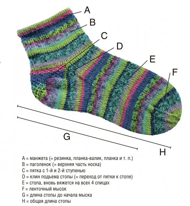 Продолжить вязание круговыми рядами. Петли распределить на 4 спицы следующим образом: петли 2-й половины пятки перевести на 1-ю спицу и по левому краю 1-й ступени из каждого 2-го ряда вывязывать по 1 п. для клина подъема стопы.