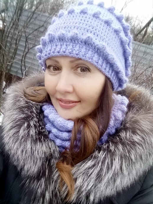 Зимний комплект. Шапка размер 55-57. Снуд в один оборот размер 60*30 см.Шапка на чехле. Чехол связан спицами лицевой гладью. Лицевая часть шапки связана крючком. Пряжа 50% мериносовая шерсть, 50%