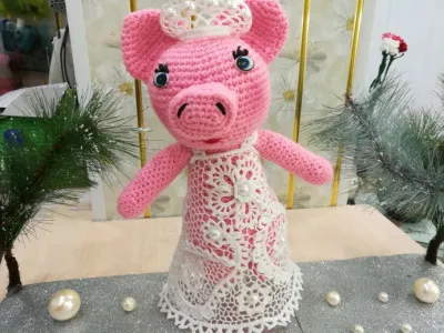 Хрюша-символ 2019года. Хрюша связана по видео-уроку,сарафан в технике ирландского кружево.