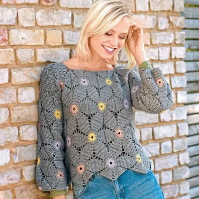 Пряжа (66% хлопка, 12% шерсти яка, 22% полиамида; 145 м/50 г) — 400 (500) г серо-зеленой и по 50 г сиреневой, желто-зеленой и розовой; крючок №4 и 5 (4,5 и 5,5).